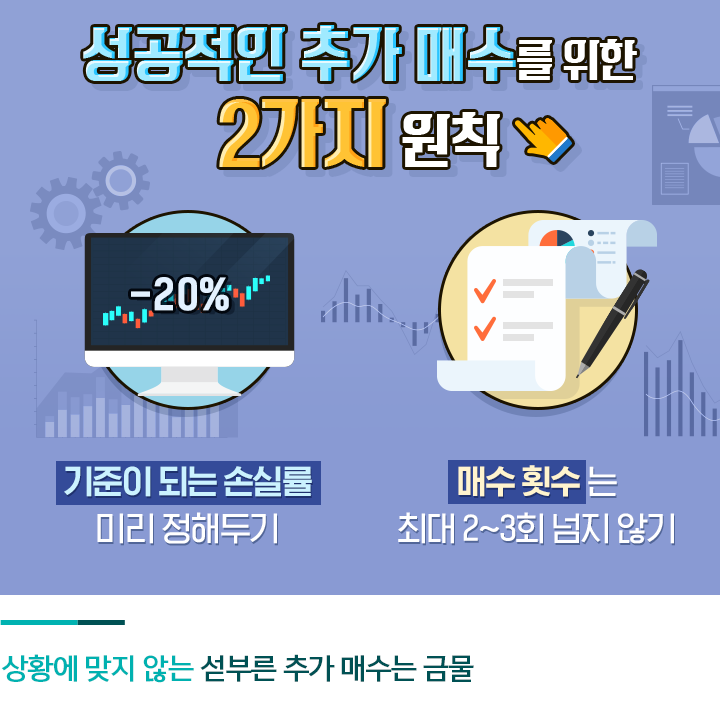 따라서 추가 매수를 하려고 할 때는 몇 가지 규칙을 정해 두는 것이 좋은데요. 매수 횟수를 2~3회로 한정하거나 기준이 되는 손실률을 미리 세워둘 수 있습니다. 예를 들어 -20% 손해 시점마다 최대 3회에 걸쳐 추가 매수한다는 원칙을 세울 수 있습니다. 단, 상황도 파악하지 않고 기계적으로 추가 매수하는 것은 피해야 합니다. 과도한 적자가 발생했거나 실적 악화가 심한 기업은 과감한 손절매를 택하는 편이 나을 수도 있습니다.
