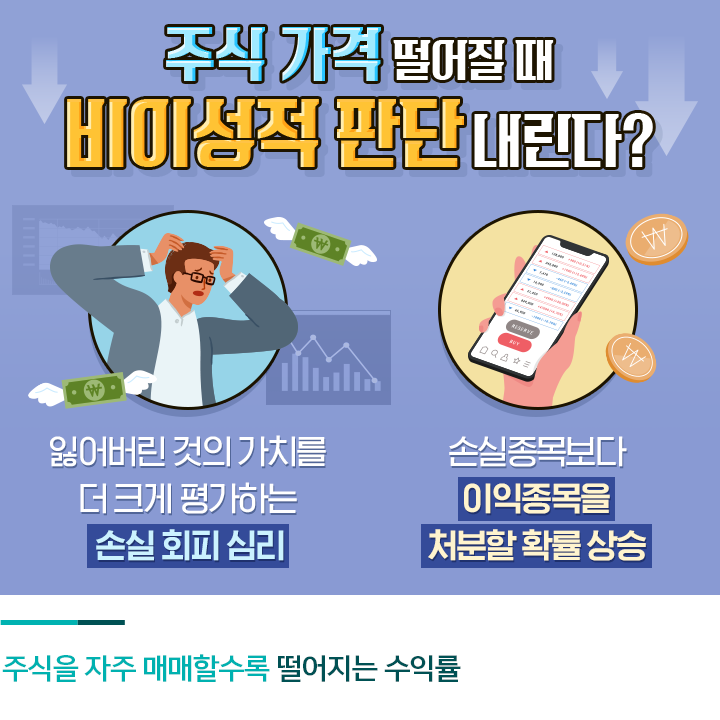 또한 오딘 교수가 6년 동안 6만명의 투자자들을 대상으로 투자 패턴을 분석한 결과, 주식을 자주 매매할수록 수익률은 오히려 떨어졌다고 합니다. 일반적으로 손해를 보면 이성적인 판단을 내리기 어려워지기 마련인데요. 손해가 발생했을 때 분명히 손절해야 하는 주식도 있지만 곧바로 주식을 팔기보다는 시장의 흐름을 관찰하며 신중하게 결정할 필요가 있습니다.