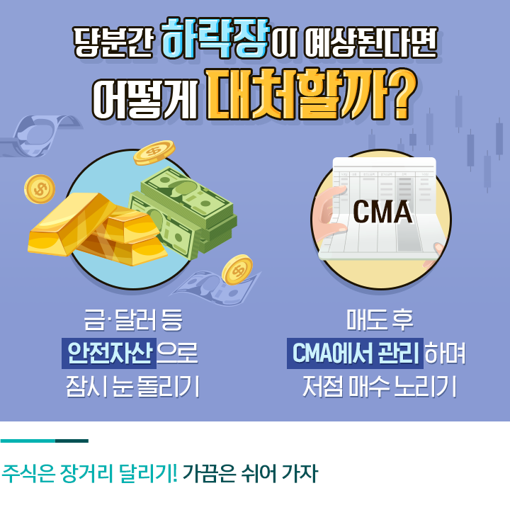 주가가 더 내려갈 것으로 예상된다면 매도 후 자산관리계좌(CMA)에 넣어 관리하는 방법도 있는데요. 일반 입출금통장보다 금리가 높고 하루만 맡겨도 이자가 발생하는 것이 CMA의 장점입니다. CMA의 높은 이자율을 활용해, 주가가 원하는 지점으로 내려갈 때까지 넣어 놓았다가 저점 매수를 할 때 사용할 수 있습니다.