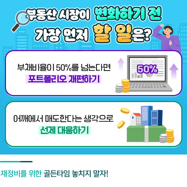부동산 시장에 큰 변화가 생기기 전 가장 먼저 검토해야 할 일은 보유한 대출과 주택을 구조조정 하는 것입니다. 전문가들은 부동산 하락장이 오기 전에 보유 주택수를 줄이고 포트폴리오를 재편해야 한다고 말합니다.