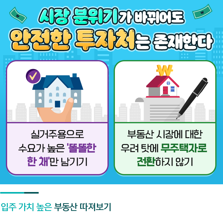 부동산 버블이 꺼질 것이라는 불안감을 이기지 못하고 무주택자로 전환하는 분들도 있습니다. 이는 바람직하지 않은 전략인데요. 부동산 시장의 변화를 맞이하기에 앞서 ‘똘똘한 한 채’로 실거주 주택을 옮긴 후, 내재 가치가 높은 실수요 주택을 장기로 보유하는 것이 리스크를 최대한 줄일 수 있는 방법입니다.