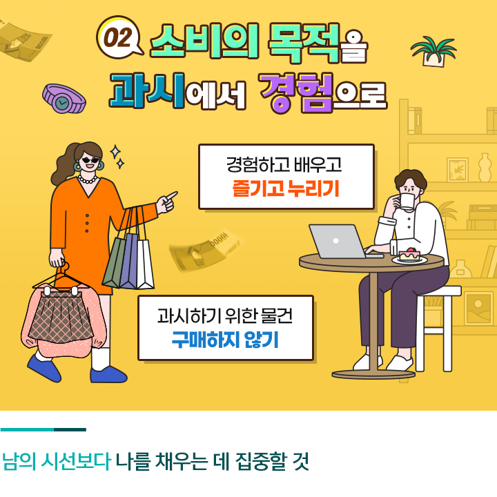 부자들은 자신들의 돈과 시간을 ‘자랑’보다 더 높은 가치에 사용합니다. 경험을 쌓거나 실질적인 필요를 채우는데 집중하는데요. 부자들은 집을 나서고 인터넷에 접속하는 순간부터 노출되는 다양한 마케팅에 쉽게 현혹되지 않습니다. 어떤 물건을 소유함으로 자신의 가치가 달라진다고 믿는 대신 실질적으로 경험하고 배우고 즐기고 누리는 것을 추구합니다.