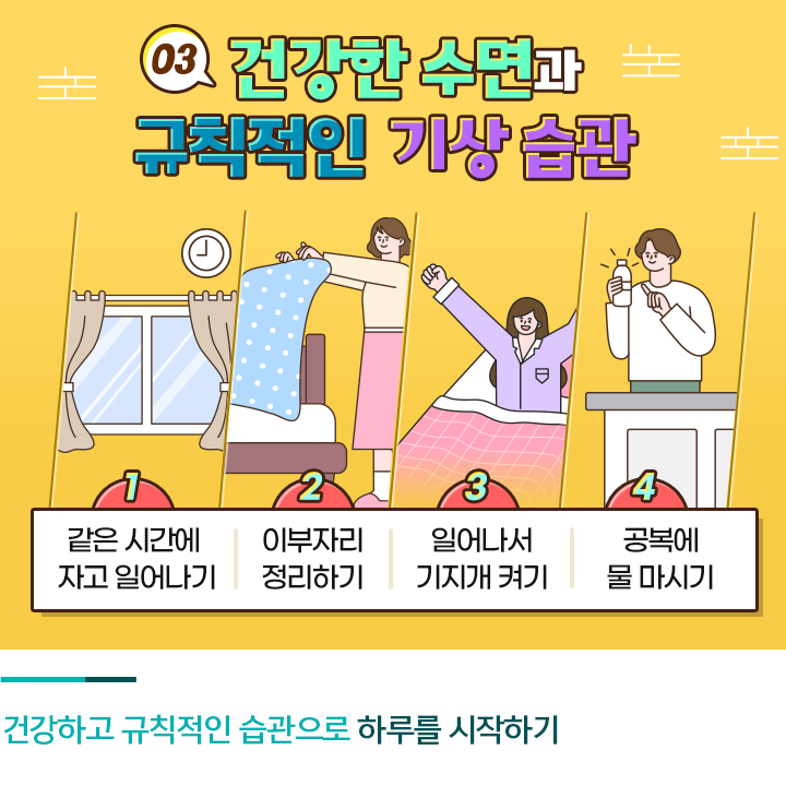 규칙적인 기상 습관도 빼놓을 수 없는 부자 습관입니다. 하루를 시작하면서 이루는 작은 성공은 활력 넘치고 자신감 있는 일상을 만들어주기 때문입니다. 일어나자마자 이부자리를 잘 정리하는 일은 성취감을 주고, 잠자리에 들 때도 정돈된 자리 덕에 안정감을 느낄 수 있습니다. 자리에서 일어나 기지개를 켜고 공복에 물 한 잔을 마시는 것 역시 건강하고 활력 있는 하루를 만드는 좋은 습관입니다.