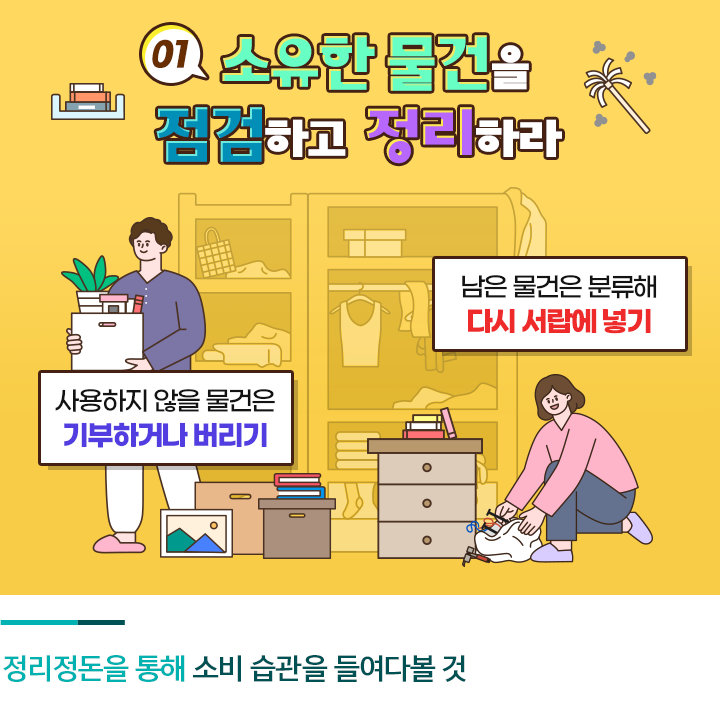 단순히 보기 좋거나 생활이 편리한 정도의 정리 정돈을 말하는 것이 아닙니다. 내가 가진 물건 하나하나를 살펴보며 그동안 얼마나 쓸데없는 물건을 많이 모았는지, 돈을 주고 사놓고도 한 번도 쓰지 않은 물건이 얼마나 많은지, 그리고 이유 없이 서로 섞어 쌓아 두었는지를 깨달아야 합니다. 충분한 점검과 성찰을 통해 소비 습관을 돌아보는 것이 목적입니다.