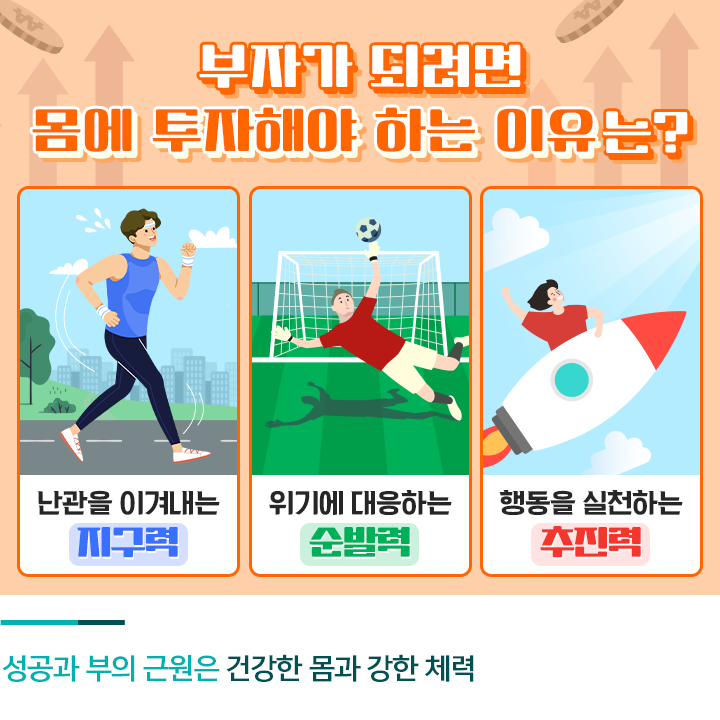 추진력과 열정이 있는 사람도 성공할 확률이 높은데요. 추진력과 열정 또한 건강한 몸에서 솟아나는 원동력입니다. 무언가를 해내고 싶다는 의지와 욕망을 가지고 이를 행동으로 이끌어내기까지는 몸의 움직임이 필수적입니다. 부자들은 아이디어를 행동에 옮기고 실천하는 과정을 통해 부를 만들어 가는데요. 아프거나 피곤하면 의욕이 떨어지고 일이나 투자를 제대로 실행할 수 없겠죠. 결국 모든 성공과 부의 근원은 건강한 몸과 체력입니다.