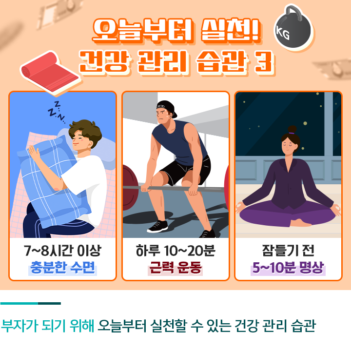 지금까지 부자들이 건강에 투자하는 이유에 대해 살펴봤습니다. 그렇다면 부자가 되기 위해 오늘부터 실천할 수 있는 건강 관리 습관을 함께 알아볼까요?