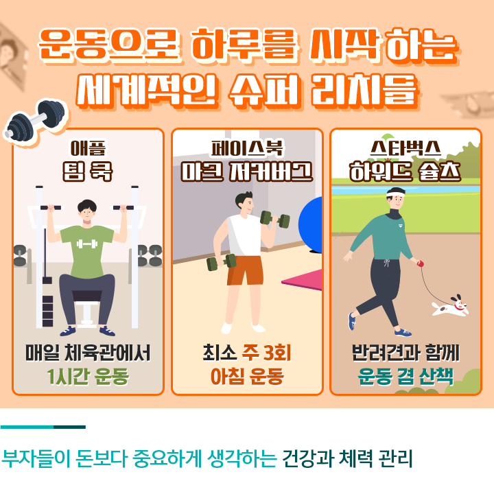 애플 CEO 팀 쿡, 페이스북 CEO 마크 저커버그, 스타벅스 명예회장 하워드 슐츠 등 세계적인 슈퍼 리치의 아침 루틴에는 공통점이 있습니다. 바로 운동입니다. 규칙적이고 꾸준한 운동을 통해 모든 일의 원동력이 되는 체력을 관리합니다. 사실 이들의 몸값은 돈으로 환산할 수 없죠. 그 어떤 투자보다 몸에 투자하는 이유가 바로 이것입니다. 부자들은 운동뿐만 아니라 평소 수면, 식습관 등 여러 면에서 건강 관리를 중요시합니다.
