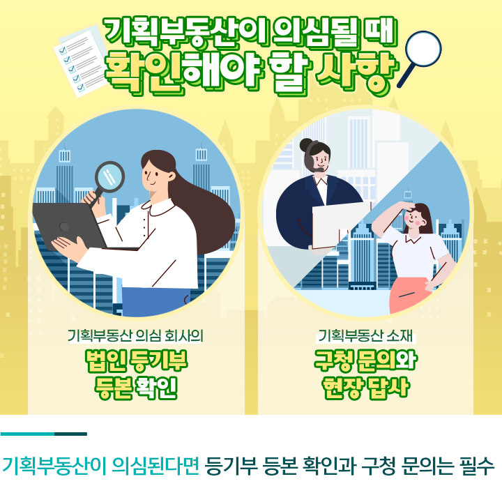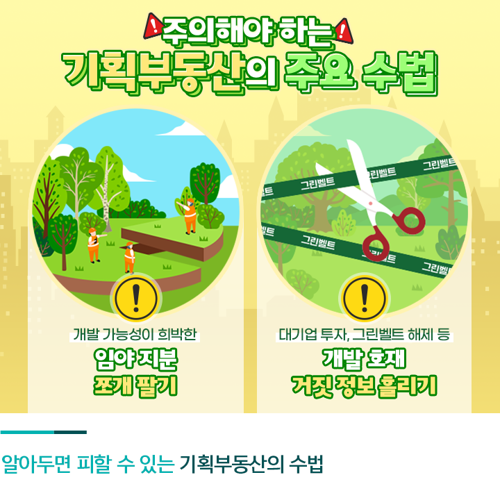 기획부동산이란 각종 개발 호재 등을 미끼 삼아 실제로는 경제적 가치가 없는 땅을 쪼개 팔거나 지분을 나눠 분양하는 사기 행위를 말합니다. 날이 갈수록 부동산에 대한 관심이 높아지면서 이를 노린 기획부동산도 함께 늘어나 주의가 필요한데요. 특히 부동산 호재에 관심이 높은 개인 투자자는 기획부동산의 허위 정보에 이끌릴 우려가 큽니다.
