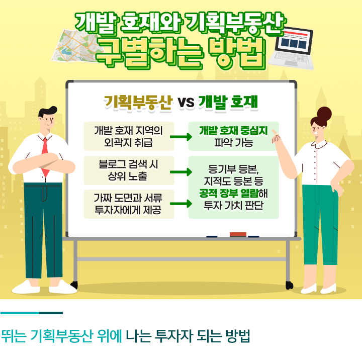 호재는 빠르게 파악할수록 이득이지만 그 과정에서 주의해야 할 점이 있습니다. 바로 개발 호재를 미끼로 피해자를 유혹하는 기획부동산인데요. 오늘은 하나은행 1Q블로그와 함께 기획부동산의 실체를 알아보고 개발 호재와 기획부동산을 구별하는 방법에 대해 살펴보겠습니다.