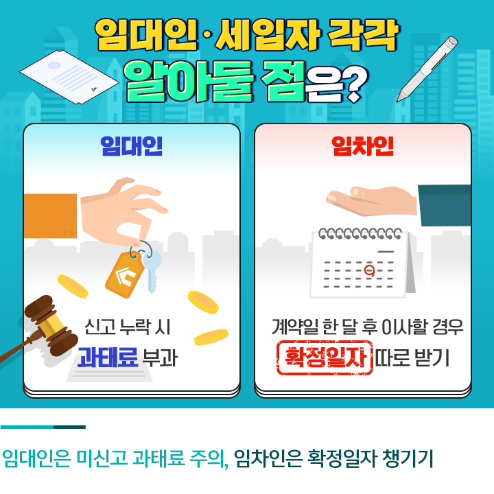 전월세 신고제가 새롭게 시행되는 만큼 내용을 꼼꼼히 살펴 두지 않으면 뜻하지 않은 실수를 범할 수 있는데요. 임대인과 임차인 입장에서 각각 놓치지 말아야 할 부분에 대해 알아보겠습니다.