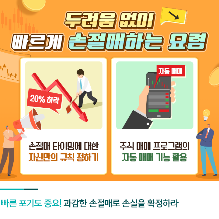 하지만 과감한 손절매는 쉽지 않은데요. 손절매를 두려워하지 않고 결단력 있게 실행하는 요령은 손절매 타이밍에 대해 자신만의 규칙을 정하는 것입니다. 예를 들어 10% 또는 20% 하락하면 무조건 매도한다고 규칙을 정해두면 망설이느라 타이밍을 놓칠 일이 없습니다. 그래도 결단력이 부족하다면 주식 매매 프로그램에서 제공하고 있는 자동 매매 기능을 활용해 일정 수준 이상 주가가 하락했을 때 자동으로 매도가 이루어지도록 하는 것 또한 방법입니다. 물론 이러한 규칙은 장기 투자 종목에 대해서나 글로벌 경제 이슈 등에 따라 주식 시장 전체가 움직일 때는 예외가 되겠죠.