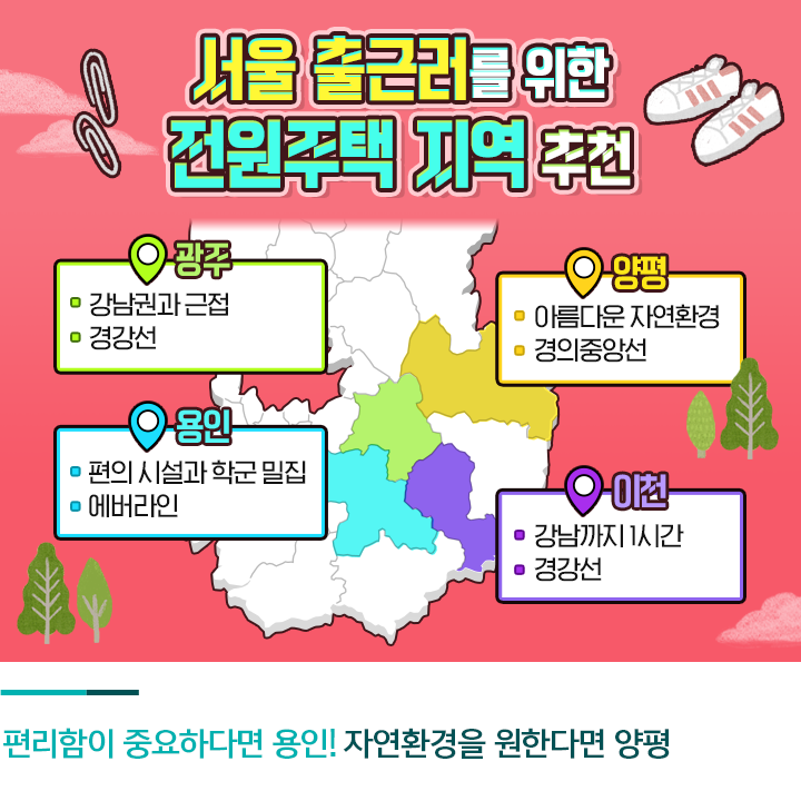 전원생활을 꿈꾸면서도 실행에 옮기기 힘든 이유는 대부분 출퇴근 문제입니다. 그러나 서울로 자차뿐만 아니라 대중교통으로 출근이 가능한 전원주택 지역도 얼마든지 있습니다. 도심으로의 접근성이 좋고 대중교통망, 풍부한 생활 인프라 등 기반 시설이 잘 갖춰져 비교적 불편함 없이 생활 가능한 대표적인 전원주택지로는 용인, 광주, 이천, 양평 등이 있습니다.