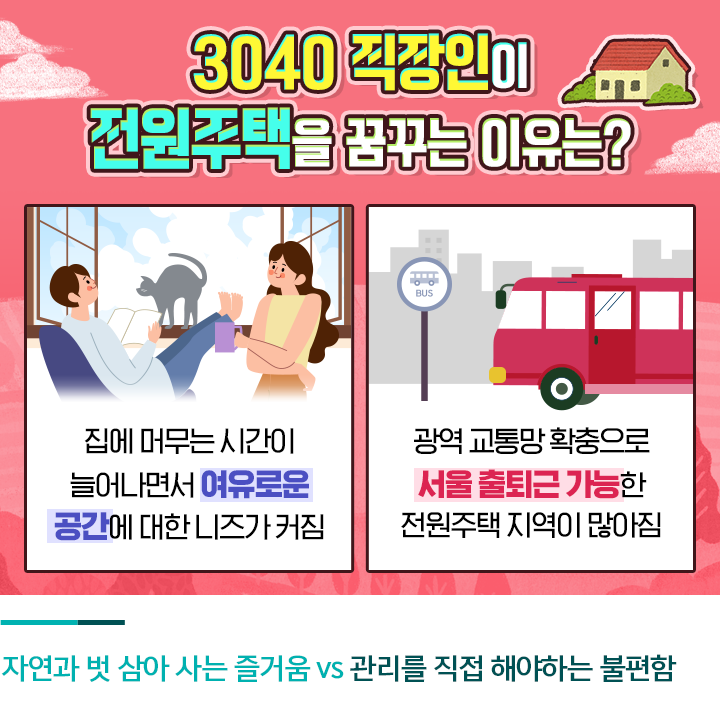 코로나19는 우리의 생활과 가치관의 많은 영역을 바꿔 놓았는데요. 그중 하나가 집에 대한 생각입니다. 재택근무를 비롯해 집에 머무는 시간이 늘어나면서 보다 넓고 여유로운 공간, 자연을 느낄 수 있는 공간에 대한 니즈가 커졌습니다. 그러면서 자연스럽게 전원주택이나 타운하우스에 대한 관심이 높아졌죠. 특히 광역교통망 확충으로 서울로 출퇴근이 가능한 전원주택 지역이 많아지면서 서울 통근러 또한 전원주택 생활을 꿈꿀 수 있게 되었습니다.