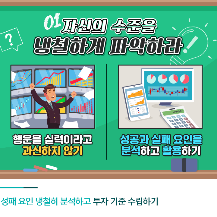 투자 시장은 준비가 부족하거나 겸손을 잃은 사람에게는 한없이 냉혹합니다. 투자 후 수익률 계산이 끝난 후에 성공과 실패 요인을 분석하고 다음 투자에 활용하는 ‘환류 과정’이 반드시 필요합니다. 왜 투자에 성공했고 실패했는지를 모르면 앞으로 투자에 도움이 되는 교훈을 얻을 수 없기 때문입니다.