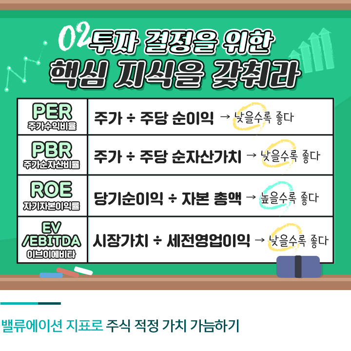EV/EBITDA도 많이 활용하는데요. 기업의 시장가치(EV)를 세전영업이익(EBITDA)로 나눈 값입니다. EV는 상장회사를 100% 인수하는 데 들어가는 기본적인 비용의 개념이라고 할 수 있습니다. EVITDA는 이자비용과 세금, 감가상각을 차감하기 전 이익입니다. 회계조작 파문이 일었던 외환위기 직후부터 본격적으로 사용된 개념으로, 기업의 실질적인 현금흐름을 파악하기 위해 주로 사용합니다. EV/EBITDA가 낮을수록 저평가된 종목으로 해석할 수 있습니다.