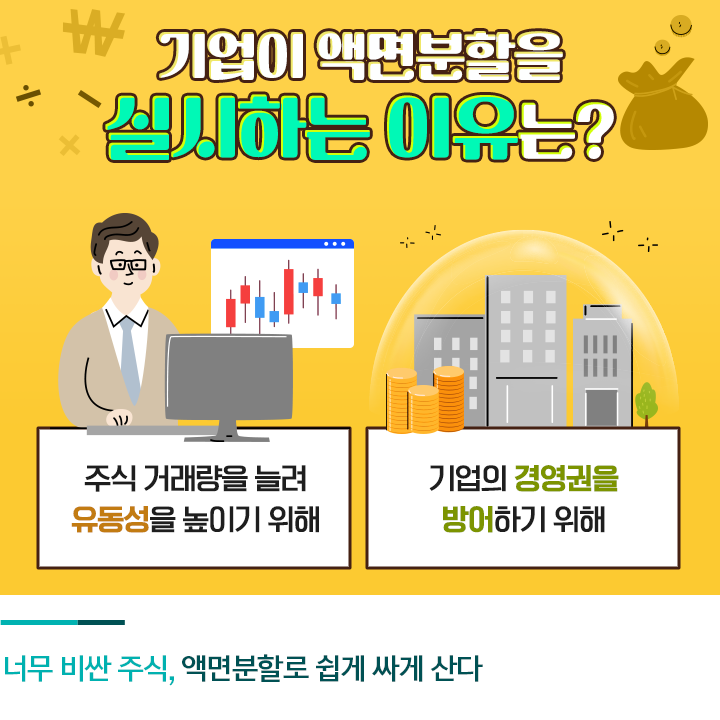 기업이 액면분할을 실시하는 가장 큰 이유는 주식 가격을 낮추고 거래량을 늘려 주식의 유동성을 높이기 위해서입니다. 상장된 주식 수가 적으면 거래량도 적기 때문에 사고팔기가 어려워지는데요. 주식의 유동성을 늘려야 할 필요가 있는 기업의 경우 액면분할을 고려하게 됩니다.