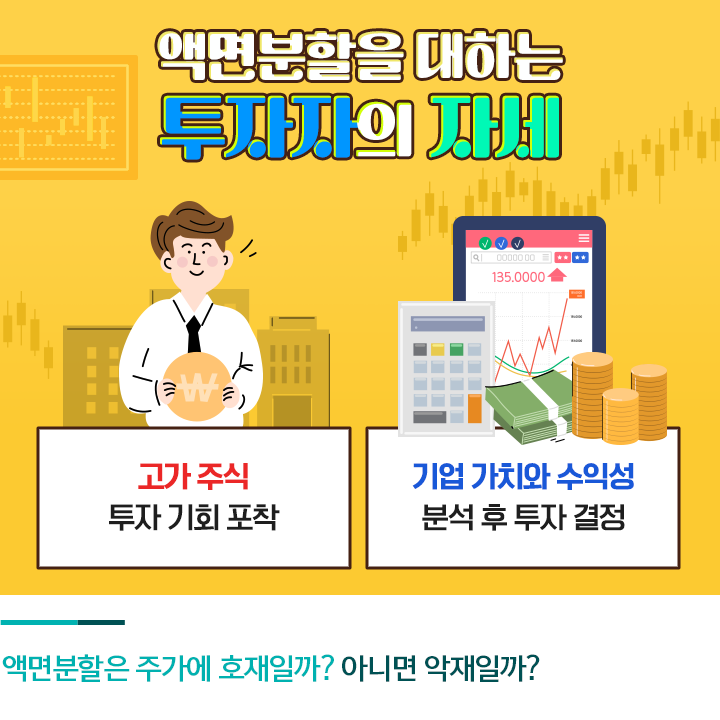 개인 투자자 입장에서는 기업의 액면분할이 고가주에 투자할 기회가 되기도 하는데요. 액면분할로 고가주의 가격이 낮아졌다고 무작정 투자하는 것은 금물입니다. 액면분할 자체만으로 기업의 펀더멘털이 바뀌는 것은 아니기 때문에 기업의 가치와 수익성 등을 종합적으로 분석해 투자를 결정해야 한다는 것이 전문가들의 조언입니다.