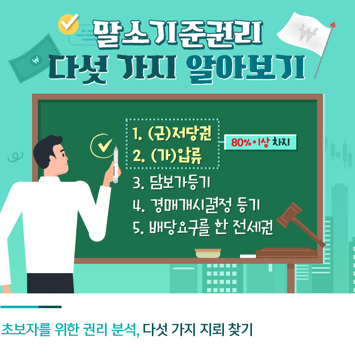 즉, 권리 분석의 핵심은 낙찰자에게 인수되는 권리가 있는지를 판단하는 것입니다. 부동산 경매 초보라면 ‘말소기준권리’ 다섯 가지만 기억하면 되는데요. 등기부상에서 (근)저당, (가)압류, 담보가등기, 경매개시결정 등기, 배당요구를 한 전세권 등 5개의 단어를 찾는 것입니다. 이 중 등기부에 기재된 순서가 가장 빠른 권리가 말소기준권리가 됩니다. 말소기준권리 아래의 채권은 모두 삭제됩니다.