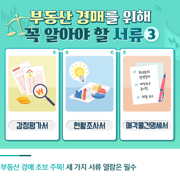 부동산 경매는 권리 분석과 복잡한 용어 때문에 진입장벽이 높다고 여겨지는데요. 우선 세 가지 필수 서류를 알면 됩니다. 감정평가서와 현황조사서, 매각물건명세서인데요. 모두 법원 경매정보 사이트에서 확인할 수 있습니다. 먼저 감정평가서는 법원이 경매 부동산을 공인된 감정 평가 기관에 의뢰하여 최종 매각 금액을 산정한 내역인데요. 감정 평가의 근거(명세표)와 위치 및 지적도, 내부 구조도, 현장 사진이 포함되어 있습니다. 감정 일자와 입찰일 간의 시차가 큰 경우 현 시세를 반영하지 못하는 경우가 있기 때문에 입찰가를 산정할 때는 감정 가격을 참고만 하는 것이 좋습니다.