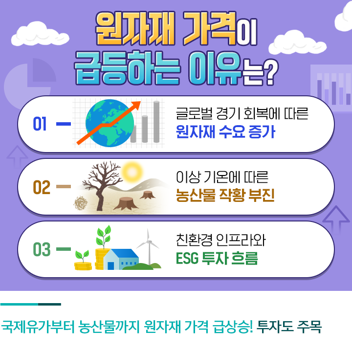 이상 기온에 따른 농산물 작황 부진, 주요 광산 파업 등도 원자재 가격에 영향을 미치는 요소입니다. 또 친환경 인프라와 ESG 투자 흐름도 구리, 팔라듐, 리튬 등의 원자재 가격 상승을 이끌고 있습니다.