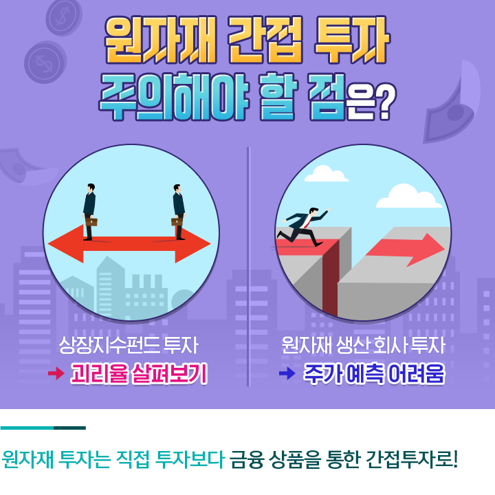 간접 투자는 적은 금액으로도 원자재에 쉽게 투자할 수 있다는 것이 가장 큰 장점입니다. 금이나 은, 원유, 구리, 농산물 등 주요 원자재의 경우 대부분 다양한 펀드 상품을 운용하고 있어 개인 투자자도 접근이 쉽습니다. 한 가지 주의할 점은 이러한 파생상품에 투자할 때는 괴리율을 반드시 살펴야 한다는 것입니다. 괴리율은 시장 가격과 실제 가치의 차이를 나타내는 투자 위험 지표인데요. 괴리율이 크다는 것은 매매 가격이 기초자산보다 고평가 되어 있다는 의미이기 때문에 괴리율이 줄어든 후에 매입하는 것이 향후 손실을 줄일 수 있습니다.