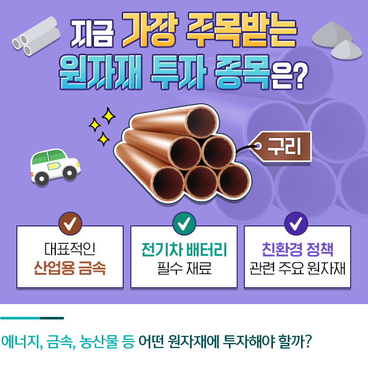 얼마 전 한 매체에서 경제 전문가들을 대상으로 원자재 유망 종목에 대해 조사한 결과, 구리가 압도적인 1위를 차지했다고 합니다. 자동차, 건설, 전자제품 등에 광범위하게 쓰이는 구리는 산업용 금속의 대표 격이라고 할 수 있는데요. 경기가 반등할 때 값이 오르고 침체될 때 값이 떨어지기 때문에 글로벌 실물 경제의 흐름을 미리 짚어볼 수 있는 기준이 되기도 합니다.