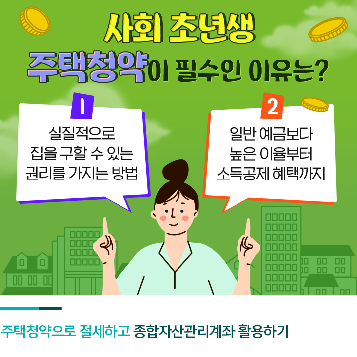 사회 초년생 앞에 놓인 최대의 자산관리 과제는 내 집 마련 자금을 확보하는 것입니다. 주택청약은 비교적 유리한 조건으로 저축을 하는 효과에 더해서 실질적으로 집을 구할 수 있는 권리를 가질 수 있는 방법입니다. 과거처럼 4%의 높은 금리를 보장하지는 못하지만, 사회 초년생 입장에서 내 집 마련을 꿈꾼다면 주택청약을 대체할 상품은 없습니다.