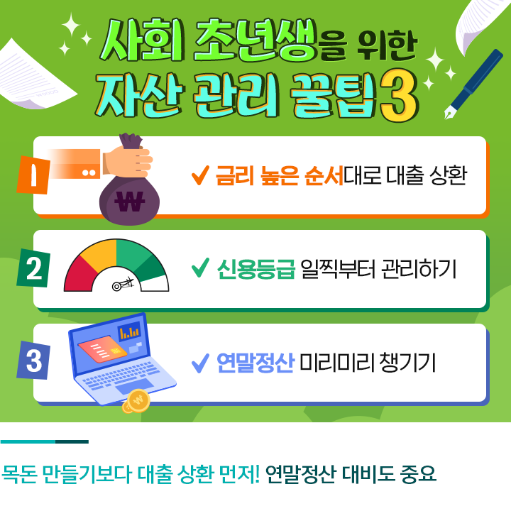 사회 초년생이 고민하는 것 중 하나가 대출 상환이 먼저냐, 목돈 만들기가 먼저냐 하는 부분인데요. 목돈이 없는 상태에서는 대출 상환에 우선순위를 두는 것이 좋습니다. 대출은 금리가 높은 것부터 순차적으로 정리해야 합니다. 신용카드 현금서비스나 카드론, 리볼빙과 같은 단기 대출을 우선 상환하고, 신용대출, 학자금 대출 등의 순서로 갚는 것이 좋습니다.