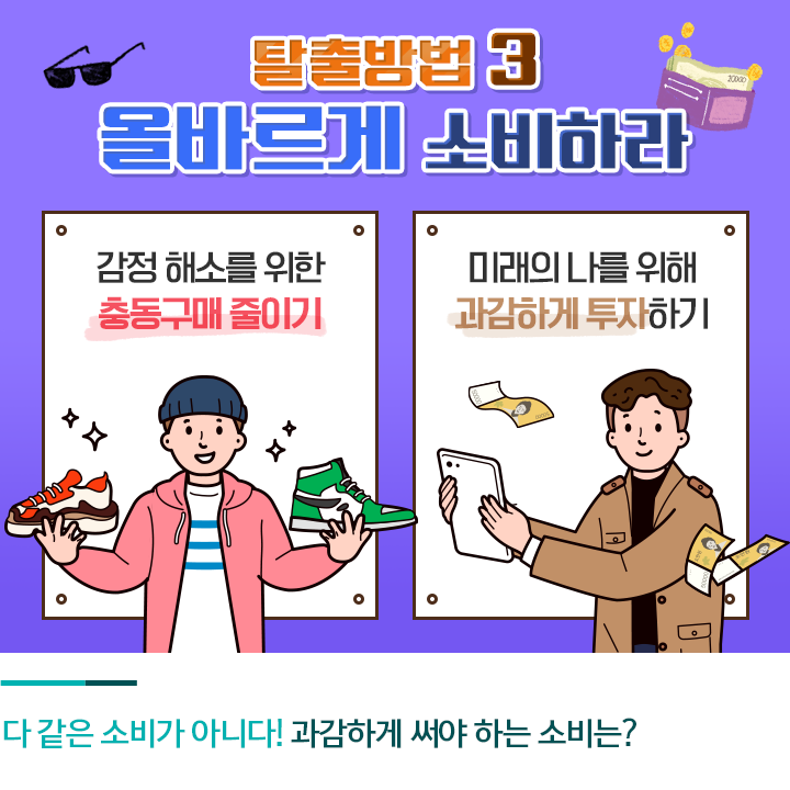 반면 자기계발, 건강 등 미래의 나를 위한 소비는 일종의 투자입니다. 감정 소비는 줄여야겠지만, 그렇다고 자기에게 꼭 필요한 소비까지 줄이게 되면 나중에 오히려 더 큰 대가를 지불해야 할 수도 있죠. 낭비가 아닌 투자를 위한 소비라면 과감하게 실행해야 하는데요. 감정 소비는 줄이고 꼭 필요한 소비에 돈을 쓸 수 있도록 소비 가치관을 형성할 필요가 있습니다.