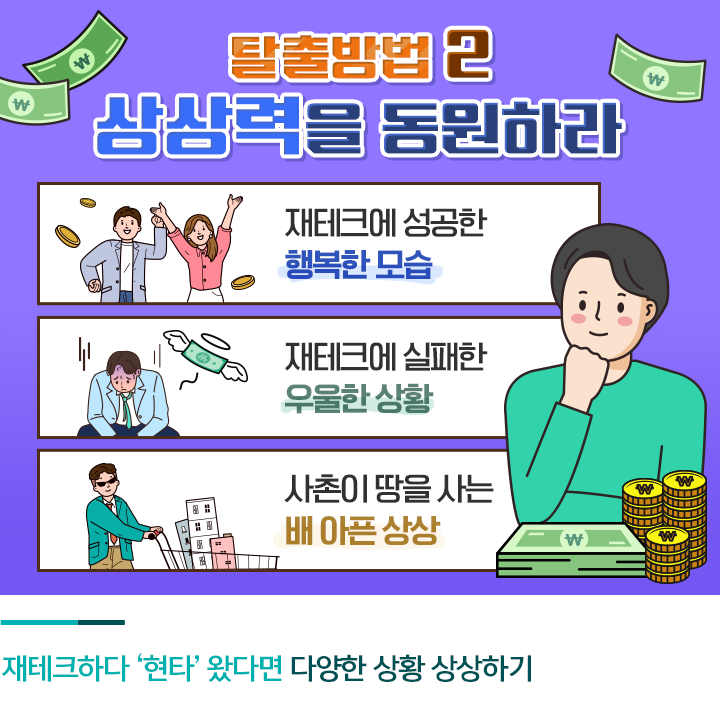둘째는 반대로 재테크에 실패했을 때의 우울한 모습을 상상하는 겁니다. 예를 들면 도중에 돈 모으기를 포기해 내 집 마련을 못한 경우를 상상할 수 있겠죠. 집주인과의 갈등, 주기적으로 이사를 해야 하는 번거로움, 좁고 불편한 집 등 우울한 상황을 떠올리는 것도 때로는 동기부여가 될 수 있습니다. 물론 지나친 비관이나 자학으로 빠지지 않게 주의해야겠죠.