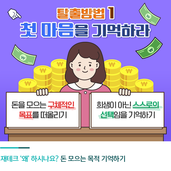 재테크를 가장 열심히, 즐겁게 수행할 수 있는 시기는 재테크를 처음 시작했을 때입니다. 돈을 모으는 동기와 목적이 가장 확실한 시기이기 때문이죠. 목표가 확고하다면 재테크 과정에서 따라오는 크고 작은 어려움은 충분히 이겨낼 수 있습니다. 만약 돈을 모으는 과정이 너무 힘들고 어렵다면 처음 재테크를 시작했을 때 설정한 목표가 희미해진 것은 아닌지 점검해야 합니다.