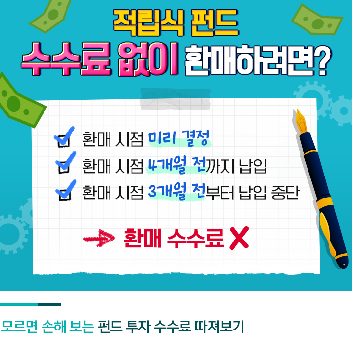 앞서 언급한 환매 수수료는 일종의 위약금인데요. 대부분의 펀드가 3개월 미만, 즉 90일 동안 발생한 수익금의 70%를 환매 수수료로 부과합니다. 이런 경우 90일 이상 투자를 지속했다면 환매수수료를 내지 않아도 되겠죠. 그러나 매달 납입하는 적립식 펀드의 경우 최근 납입한 금액 중 환매 시점에서 90일이 지나지 않은 금액에서 발생한 수익금에 환매수수료를 부과하고 있습니다.