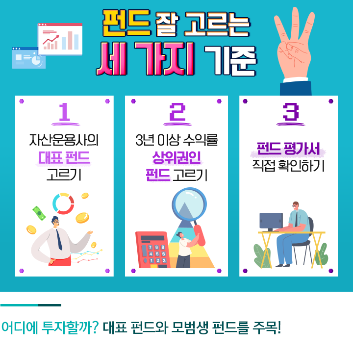 정해진 월급으로 펀드 투자를 하는 직장인이라면 이슈 펀드보다는 안정적인 ‘대표 펀드’에, 해외 펀드보다는 잘 아는 ‘국내 펀드’에 투자하는 것이 좋다고 합니다. 오늘 알려드린 내용이 본업에 지장 없이 안정적인 수익을 내는 좋은 투자를 실현하는 데 도움이 되시기를 바랍니다.