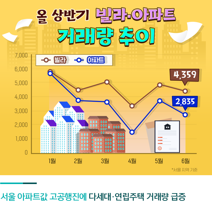최근 몇 년 간 아파트값 급등과 더불어 전세가까지 동반 상승하면서 아파트 대신 빌라, 즉 다세대나 연립주택으로 눈을 돌리는 이들이 늘고 있습니다. 서울은 6개월째 다세대·연립주택 거래량이 아파트 거래량을 상회하고 있는데요. 보통은 월간 기준으로 아파트 거래량이 다세대·연립주택 거래량보다 2~3배 많은 것이 일반적이었으나, 올해 들어 서울 지역 다세대·연립주택 거래량이 아파트 거래량을 앞서기 시작하더니 지난 6월에는 다세대·연립주택 매매 건수가 4,359건으로 아파트 매매 건수 2,835건보다 1,500건 이상 많았습니다.