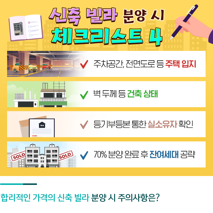 마지막으로 신축빌라 매매 시 잔여세대를 공략해 조금 더 싸게 사는 것도 좋은 방법입니다. 70% 이상 분양이 완료되었다면 나머지는 잔여세대로 볼 수 있는데요. 잔여세대에 대해서도 분양사무소의 말보다는 직접 체크해 보는 것이 정확합니다.