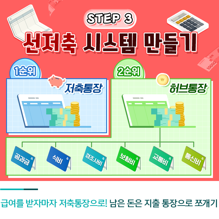 종잣돈을 만드는 힘은 ‘선저축 시스템’에서 나옵니다. 가장 좋은 방법은 통장 쪼개기인데요. 급여 통장과 별도로 수입이 들어오면 한곳에 모았다가 필요한 곳에 배분하는 허브 통장을 만듭니다. 다음으로 지출 항목에 따라 통장을 다시 분리합니다. 공과금 통장, 식비 통장, 경조사비 통장, 보험-의료비 통장, 교통비 통장, 통신비 통장 등입니다.