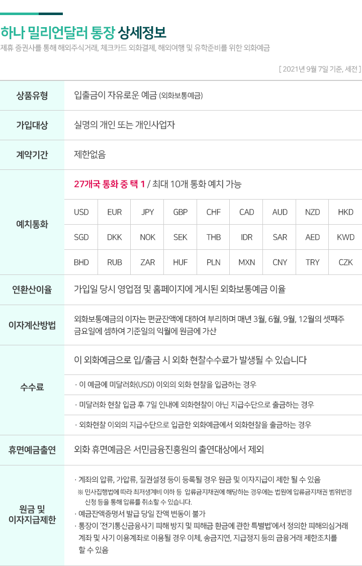이른바 서학개미(해외주식 투자자)로 불리우는 국내 투자자들이 보유한 해외주식 투자 잔액은 어느덧 100조원을 넘어섰고, 해외직구 거래액도 2020년을 기준으로 4조원을 돌파 했습니다. 이런 소비자들의 글로벌 트렌드에 맞추어 하나은행에서는 27개 통화 중 최대 10개 통화로 예치가 가능하고, 삼성증권 제휴를 통해 증권사 이체없이 내 통장에서 바로 해외주식투자를 할 수 있는 외화 다통화 입출금 통장인 「하나 밀리언달러 통장」을 출시 하였습니다.