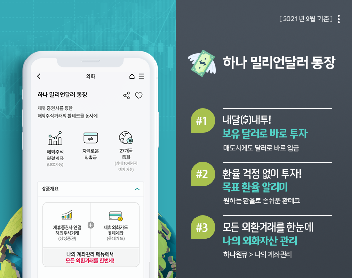 이른바 서학개미(해외주식 투자자)로 불리우는 국내 투자자들이 보유한 해외주식 투자 잔액은 어느덧 100조원을 넘어섰고, 해외직구 거래액도 2020년을 기준으로 4조원을 돌파 했습니다. 이런 소비자들의 글로벌 트렌드에 맞추어 하나은행에서는 27개 통화 중 최대 10개 통화로 예치가 가능하고, 삼성증권 제휴를 통해 증권사 이체없이 내 통장에서 바로 해외주식투자를 할 수 있는 외화 다통화 입출금 통장인 「하나 밀리언달러 통장」을 출시 하였습니다.