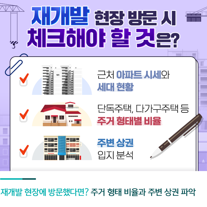 재개발 현장 방문 시 가장 중요하게 확인해야 할 사항은 주거 형태별 비율인데요. 단독주택이나 다가구주택, 다세대주택이 얼마나 있는지를 파악하는 것입니다. 다세대주택의 비율이 높은 곳은 사업 진행에 걸림돌이 적습니다. 반면 단독주택이나 다가구주택의 비율이 높으면 재개발 사업을 반대하는 세력도 많은 편인데요. 특히 상가가 밀집돼 있거나 구역 내에 시장이 있는 경우에는 권리금 문제로 사업 진행이 늦어질 가능성이 높다는 점에 주의해야 합니다.