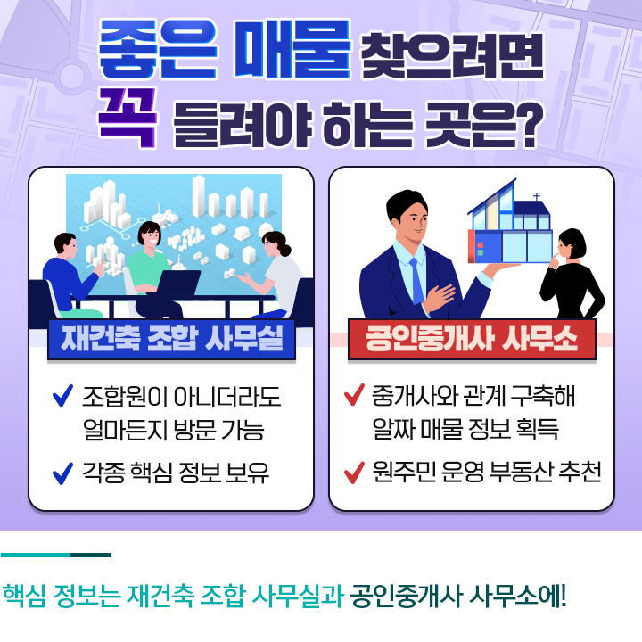알짜 매물을 찾기 위해서는 두 곳을 꼭 들러야 하는데요. 바로 재건축 조합 사무실과 공인중개사 사무소입니다. 조합 사무실은 초보 투자자들에겐 다가가기 어렵게 느껴질 텐데요. 사실 조합 사무실은 조합원이 아니더라도 누구라도 방문할 수 있고 진짜 고급 정보를 들을 수 있는 곳입니다. 해당 구역의 사업 진행 현황, 예상 기간, 현금청산자의 비율, 조합 정관에 따른 근린 생활이나 과소필지 소유자의 입주권 가능 여부, 외부 투자자들의 승계 비율 등을 확인할 수 있습니다. 관리처분계획인가 이후라면 이주비 대출 등에 대한 조합의 향후 계획까지 들을 수 있습니다. 보다 쉽게 정보를 얻기 위해선 음료와 같은 작은 성의를 표하는 것이 팁이라고 하네요.