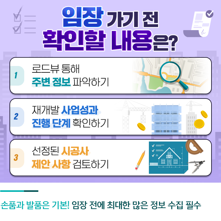 좋은 재개발 매물을 찾기 위한 기본은 손품과 발품인데요. 특히 재개발 매물은 꼼꼼한 사전 조사와 더불어 현장감을 익히는 임장 활동이 중요합니다. 책 『나의 첫 재개발 실전 투자』의 저자 케언즈맨은 이론적 지식이 아무리 많더라도 현장을 직접 가지 않으면 좋은 매물을 찾기 힘들다고 강조하는데요. 먼저 동네의 장단점을 잘 이해하고 있는 재개발 구역부터 임장을 시작해 보는 것이 좋습니다. 같은 장소를 여러 번 가보면서 사전답사의 경험을 쌓는 것이 주목적이죠.