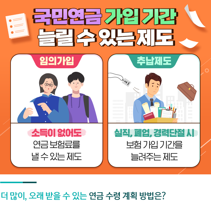 추납제도는 국민연금 가입 후에 실직, 폐업, 경력단절 등으로 보험료를 납부하지 못한 기간이 있을 경우 이 기간에 대해 납부할 수 있도록 가입 기간을 늘려주는 제도인데요. 추가로 보험료를 낸 기간만큼 가입 기간이 인정되어 연금수령액이 늘어나게 됩니다.