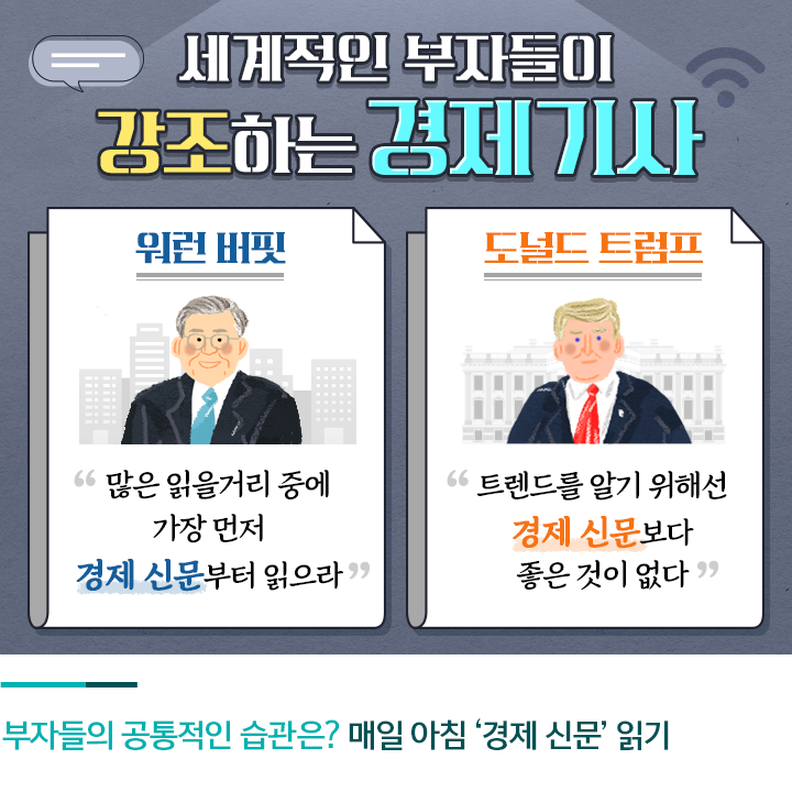 세계적인 부자들 역시 경제기사를 읽으며 하루를 시작하는데요. 워런 버핏은 신문을 읽는 데에 하루 중 많은 시간을 할애하는 것으로 알려져 있습니다. 한 번은 주주총회에서 ‘읽을 것도 많고 봐야 할 것도 많은데 가장 먼저 무엇을 봐야 하나’라는 질문에 가장 먼저 경제신문부터 읽으라는 대답을 하기도 했습니다. 미국 전 대통령인 도널드 트럼프 역시 트렌드를 알기 위해서는 경제신문보다 좋은 것이 없다고 강조했습니다.