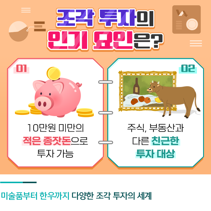소액 자산으로 다양한 분야에 투자하는 조각 투자가 인기를 끌고 있습니다. 가상 화폐 등 불안정한 자산 대신 안정적인 소액 투자처를 찾는 사람들이 늘면서 대체 투자의 일환으로 조각 투자가 각광받고 있는데요. 대상 또한 음악 저작권부터 송아지, 명품 시계까지 각양각색입니다. 전통적인 투자처인 부동산과 주식 시장에도 조각 투자의 바람이 불고 있는데요. 오늘은 하나은행 1Q블로그와 함께 적은 돈으로 투자하는 조각 투자의 세계에 대해 알아보겠습니다.