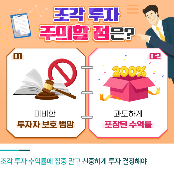 인기몰이를 하고 있는 조각 투자에도 그늘은 있습니다. 많은 전문가들은 조각 투자의 위험 요인으로 투자자 보호 법망이 미비하다는 점을 지적합니다. 조각 투자 플랫폼은 자본시장법상 금융투자업체로 등록하지 않은 곳이 대다수인데요. 그렇기 때문에 회사 부도나 자금 조달 문제 등 각종 사고 발생 시 투자자 보호가 어렵다는 문제가 있습니다.
