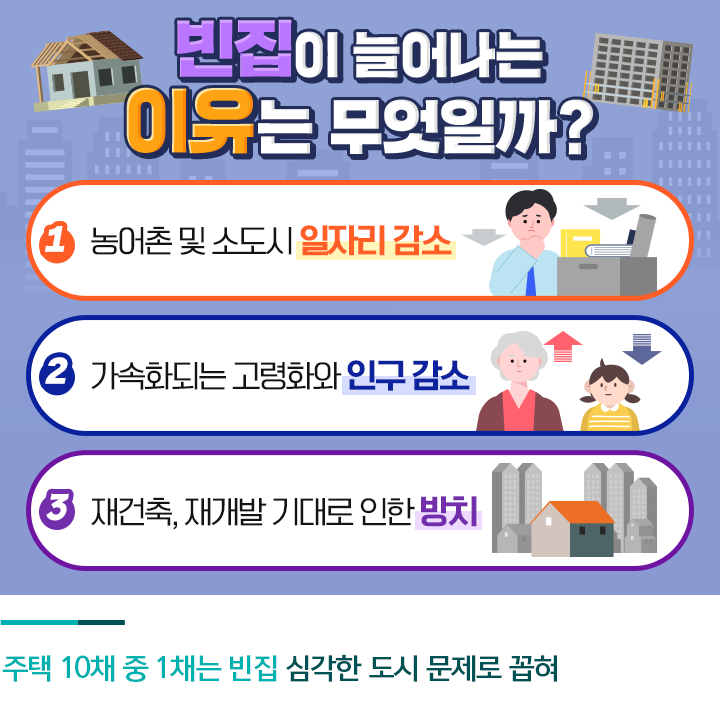 빈집이 늘어나는 이유는 다양합니다. 농어촌과 지방 소도시의 경우, 지역 쇠퇴 혹은 일자리 감소로 주거 인구가 대도시로 이동해 빈집이 생기는 경우가 많은데요. 도시에서는 재개발이나 재건축을 노리며 방치된 빈집이 대다수입니다. 많은 사회 문제의 원인으로 꼽히는 고령화와 인구 감소 역시도 늘어나는 빈집의 주된 원인 중 하나입니다.