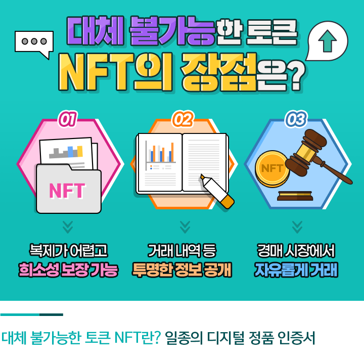 NFT란 대체 불가능한 토큰(Non Fungible Token)의 약자입니다. 하나의 토큰을 다른 토큰으로 대체할 수 없어 희소성을 특징으로 하는 디지털 자산인데요. NFT는 블록체인 기술을 기반으로 디지털 소유권을 보장해 주고 거래 증명이 가능하기 때문에 예술품이나 게임 아이템 토큰화에 주로 활용됩니다. NFT는 일종의 디지털 정품 인증서라고 생각하면 쉬운데요. 보석을 사면 보증서가 보석이 진품임을 보증해 주듯이 NFT는 이 파일이 유일하고, 소유권이 누구에게 있으며, 어떤 거래 이력이 있는지 보증합니다.