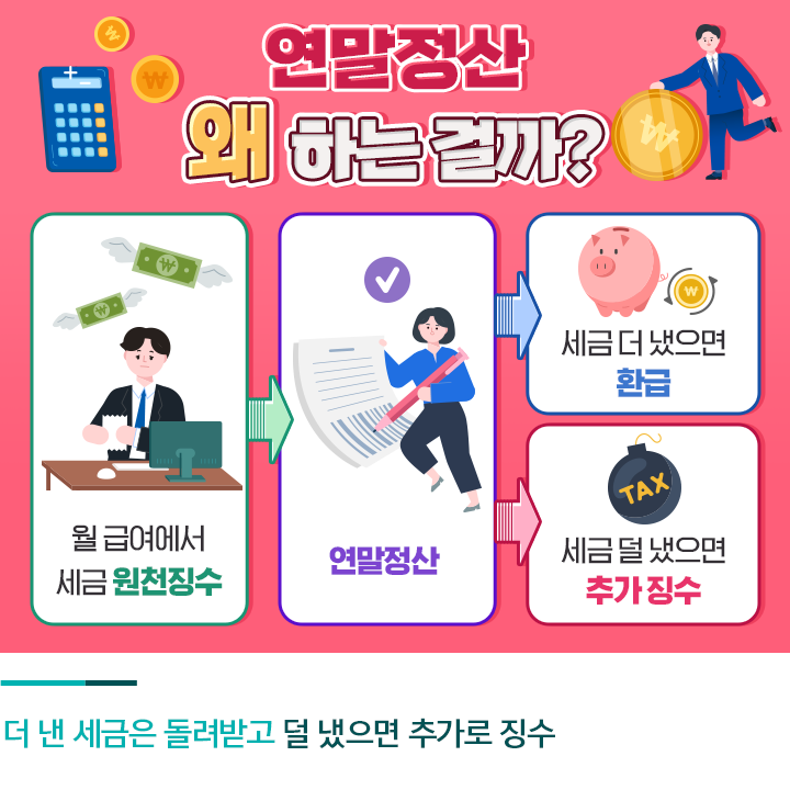 준비할 것들을 알아보기 전에 우선 연말정산이란 무엇이고, 왜 해야 하는지 알아볼 필요가 있는데요. 이제 막 사회생활을 시작하는 초년생들에게는 낯선 일이기도 하고, 직장 생활을 오래 했더라도 자세히 모르고 막연히 '13월의 월급', 또는 '세금 폭탄' 정도로 생각하는 분들이 많습니다.