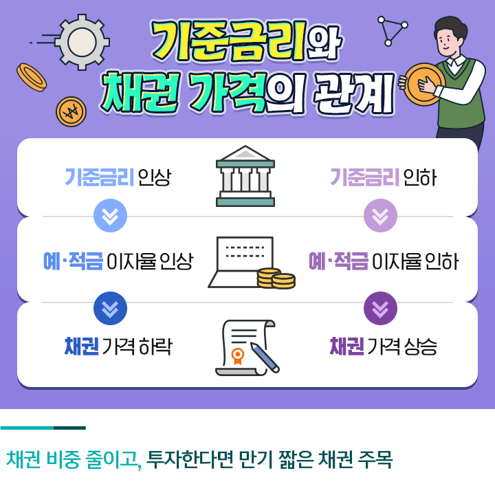 금융전문가들은 금리 인상기에 채권의 비중을 줄이는 것을 권고하기도 하는데요. 비교적 안정적인 투자처로 인식되는 채권의 경우 기준금리와 반비례하는 성향을 보입니다. 이는 채권의 이자는 고정되어 있기 때문인데요. 채권의 이자가 고정된 상황에서 기준금리 인상이 시장금리 인상으로 이어지면 채권 가격이 내려가게 되는 것이죠. 최근처럼 기준금리가 추가로 오를 가능성이 점쳐지는 상황에서는 특히 중장기 채권보다는 상황을 지켜보며 만기가 짧은 채권에 투자하는 방법이 추천되기도 합니다.