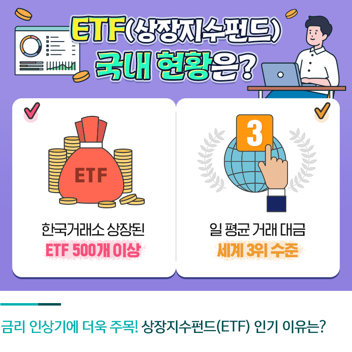 금리 인상기에 주목받는 투자처 중 하나가 상장지수펀드(ETF)입니다. ETF는 펀드를 거래소에 상장시킨 것으로 이해하면 쉬운데요. 주식처럼 손쉽게 사고팔 수 있으면서도 펀드처럼 설계되어 있어 변동성이 비교적 크지 않습니다. 요즘같이 변동성이 큰 상황에서 주목을 받는 이유입니다. 실제로 한국거래소에 상장된 ETF만 500개가 넘고, 우리나라의 일 평균 ETF 거래대금은 세계 3위 수준일 정도로 많은 사람들이 활용하고 있습니다.